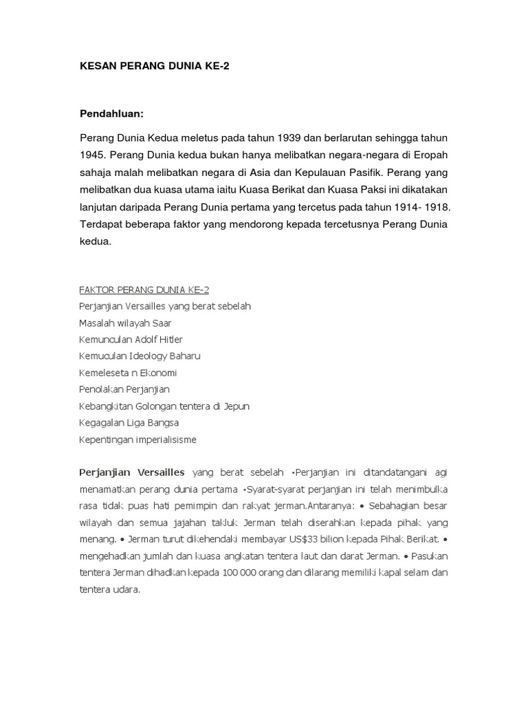Kesan Kesan Perang Dunia Kedua 11 from image.slidesharecdn.com Dalam pada itu, jerman, itali, dan jepun mewujudkan pakatan yang dikenali sebagai kuasa paksi. Perang dunia kedua meletus pada tahun 1939 dan berlarutan sehingga tahun 1945. Negara kita turut terjebak dalam perang ini di mana negara matahari terbit telah menyerang persekukutan tanah melayu di atas semangat asia milik orang asia. Membentuk pbb pada oktober 1945 bagi menggantikan liga bangsa. Pada ketika ini, jepun tersentak dengan kekalahan laut mereka ketika pertempuran midway. • • sengsaraan dan kemusnahan akibat perang. Walaupun pergerakan sebelum perang dunia kedua tidak berjaya membebaskan tanah melayu daripada belenggu penjajahan, namun pergerakan ini berjaya meninggalkan beberapa kesan positif sebagai satu asas kepada kemerdekaan pada tahun 1957. Perang dunia ii dianggap sebagai salah satu konflik terbesar dan paling mematikan dalam sejarah umat manusia.